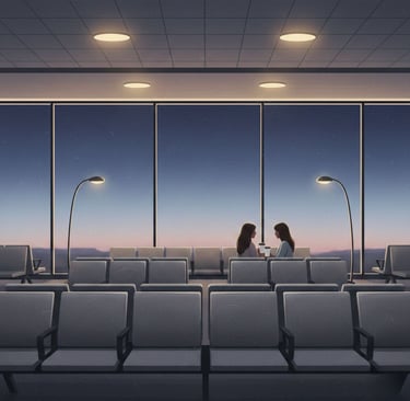 Most of the lights are dimmed, the long corridors washed in a tired yellow glow that flickers just enough to remind you no one is really meant to be awake here. Flights are delayed indefinitely. Announcements trail off mid-sentence, as if even the speakers have grown weary of pretending certainty exists.